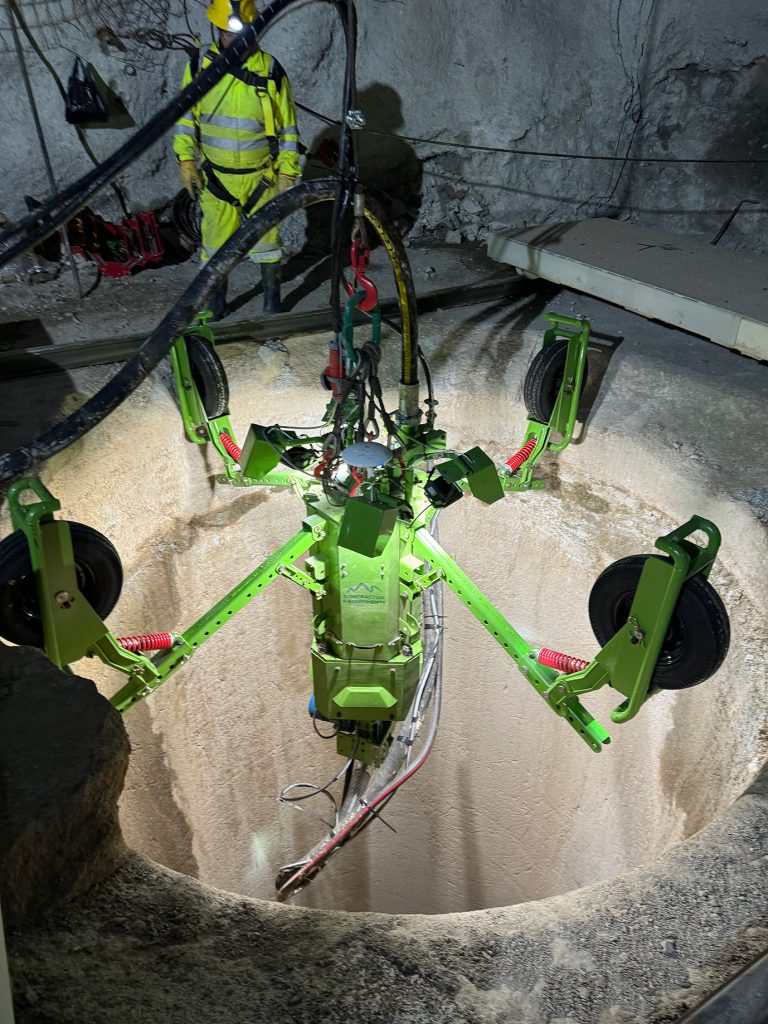 Como parte del sistema, un equipo de bombeo de concreto con dosificador de aditivo incorporado  . Todo este sistema accionado y dirigido desde una cabina de control operada desde el exterior de los pozos o chimeneas.